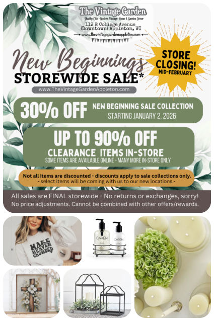 As we head into 2026, we’ll be transitioning away from our downtown Appleton storefront and moving toward pop-ups, vendor markets, and curated booth spaces — while continuing to offer the meaningful décor and gifts you love!