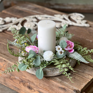 Designed to surround a pillar candle, it makes an effortless centerpiece for a dining table, coffee table, or mantel. The mix of soft greens and subtle pinks allows it to transition easily from spring décor into everyday styling without feeling seasonal or overdone.