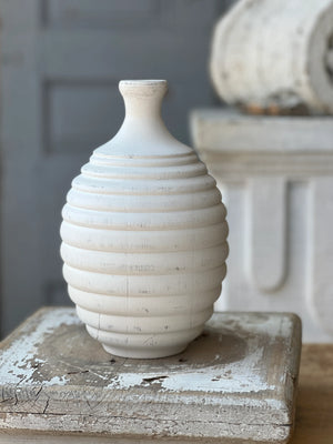 Attractive vessels with a unique ribbed silhouette and distressed finish add a wonderful dash of interest to a shelf, mantel or centerpiece!