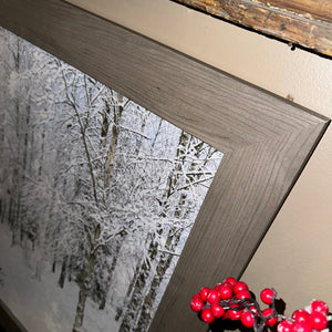 Made of composite wood -- frame has a faux paper wood finish. This piece also has a slight shimmer throughout -- just enough to add a bit of texture and dimension!
