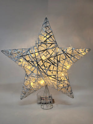Shine bright this holiday season with our beautiful lighted star tree topper. Crafted with a woven metallic frame and accented with shimmering tinsel, this radiant star casts a warm, glowing light that adds the perfect finishing touch to your Christmas tree. Its timeless design complements both traditional and modern holiday décor.