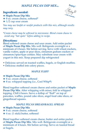 Maple Pecan: This Maple Pecan Dip Mix is a delicious treat featuring the sweet flavor of maple and the rich crunch of pecans. Whether enjoyed at breakfast smeared on waffles, at brunch or as a dessert, this mix promises to deliver the comforting flavors of home in every bite.