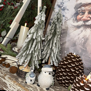 Bring the charm of a snowy forest indoors with this set of frosted pine tabletop trees. Each tree is crafted with realistic pine branches dusted in snowy flocking, set on a natural wood base for a rustic finish.