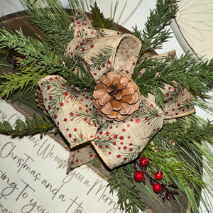 The top portion of this sign is stained, the bottom painted. The sentiment text is engraved into the wood, the family name is cute from 3mm wood and attached. We added holiday greens, berries and a festive bow to complete this cute holiday piece! *Other bow/greens options are listed separately— each is unique! This sign is made of pine -- each piece is handpainted so there WILL be variations in distressing, wood patterns, knots, dings and dents... all adding to the uniqueness of the piece. This one also includes the holiday bow and greens— I will get as close as possible to the same look as shown. You can choose to either have a jute rope hanger, or sawtooth hanger on its back. Approximate sign dimensions available: 15" Diameter x 1" Thick.