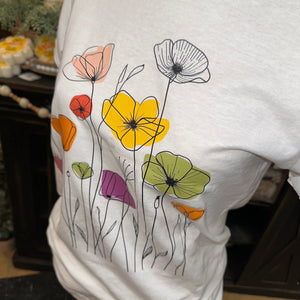 Bring a touch of whimsy to your wardrobe with this colorful, wild poppies t-shirt. Featuring a hand-drawn floral design filled with pops of soft pinks, yellows, greens, and oranges, this tee combines minimalist lines with vibrant color for a modern, artsy look. Perfect for casual days, spring outings, or pairing with jeans for an effortlessly chic style!
