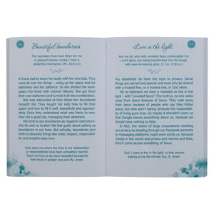 The midnight blue cover of the small devotional is splashed with bright yellow and orange flowers supported by muted blue-green leaves. Delicately understated UV-varnished leaves create an interesting texture and feel. The sentiment is presented in white and rose gold-foiled letters in the middle of the front cover.