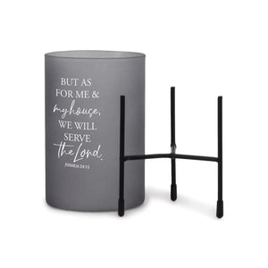 This hurricane style glass candle stand is a beautiful way to illuminate and convey an inspiring scripture verse. Frosted glass is decorated with verse on the outside. Inside is room for your own pillar style candle (not included). Holder nestles in its own black metal stand with padded feet to protect furniture.