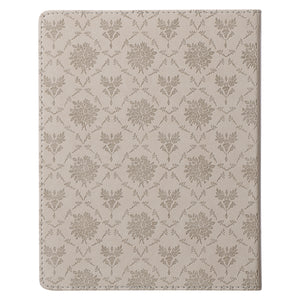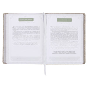 The taupe faux leather cover of the daily devotional is heat-debossed with a quatrefoil flower design stretching over the entire cover. A latte-colored vintage patch is appliquéd and placed in the center of the front cover. The patch is topstitched and features a gold foiled frame, title, and subtitle.