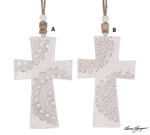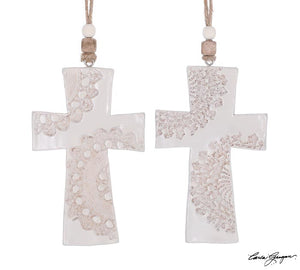 Best seller and one of my favorites to display year-round! Recessed resin with hand-painted design ivory cross shape ornament assortment. Ornaments have two different lace impressions recessed in various portions of the cross.