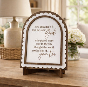 Designed with a timeless arched shape and delicate scalloped detailing, this sign features a layered wood construction that adds warmth and subtle dimension. Its neutral tones and clean design blend effortlessly with any space, from cozy shelves to styled mantels and entry tables.