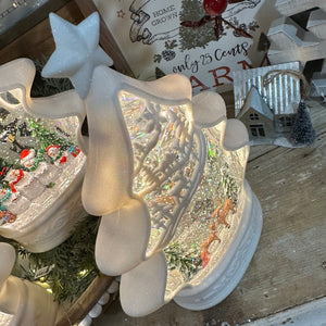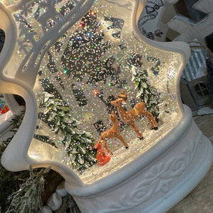 Spinning water snow globes are always a customer favorite! They are battery operated, light up and spin glitter -- such a fun addition to your winter décor! They have a built-in 6 hour timer so they will come on at the same time each day for you! This style also has the option to play music in addition to spinning the snow glitter.