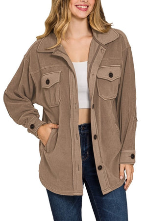 Stay warm and stylish in this oversized fleece button-up shacket, the perfect blend of a shirt and jacket. Crafted from ultra-soft fleece, it features a relaxed fit with button-front closure, chest flap pockets, and side pockets for added function and style. The oversized silhouette makes it perfect for layering over your favorite tops, giving you a laid-back yet put-together look.