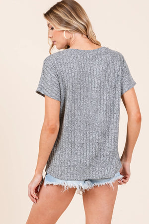 Super soft!! This grey knit top is your go-to for effortless everyday style. With its soft ribbed texture and relaxed fit, it delivers comfort without compromising on charm. Rolled sleeves add a laid-back touch, making it easy to pair with jeans or shorts for a casual, cozy look.