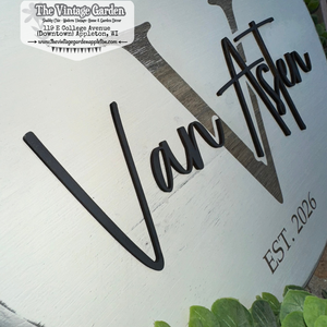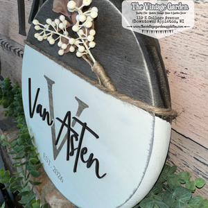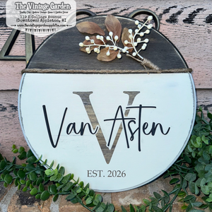 The top portion of this sign is stained in a rich, dark stain and the bottom painted a warm, neutral cream. The family name is cut from 1/4" wood and attached. The monogram and established date are engraved into the wood.