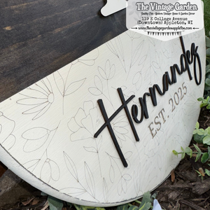 The top half of this sign is stained in a rich, dark stain and the bottom painted a warm, neutral cream with a wildflower pattern 'scored' into the paint. The monogram and family name are cut from 1/4" wood and attached (the family name is black and the monogram the same cream color as the bottom half). The established date is engraved into the wood.
