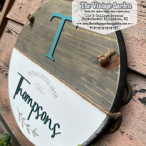 The top half of this sign is stained and the bottom painted. The monogram (if chosen) and family name are cut from 1/4" wood and attached. The established date, "THE" and leaf branch are engraved into the wood. The jute rope across the center adds a nice detailed touch, and will be added unless otherwise noted.