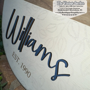 The top half of this sign is stained in a medium stain and the bottom painted a warm, neutral cream with a botanical leaf pattern 'scored' into the paint. The monogram (if chosen) and family name are cut from 1/4" wood and attached (the family name is black and the monogram the same cream color as the bottom half). The established date is engraved into the wood.