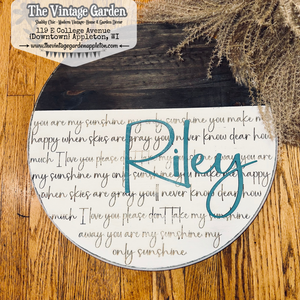 The top portion of this sign is stained, the bottom painted. The sentiment text is engraved into the wood, the name is cute from 3mm wood and attached.This sign is made of pine -- each piece is handpainted so there WILL be variations in distressing, wood patterns, knots, dings and dents... all adding to the uniqueness of the piece. You can choose to either have a jute rope hanger, or sawtooth hanger on its back. Approximate sign dimensions available: 12" Diameter, 15" Diameter or 18" Diameter x 1" Thick.