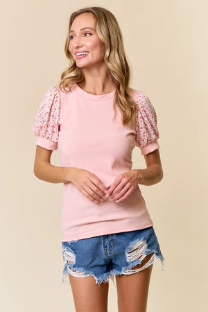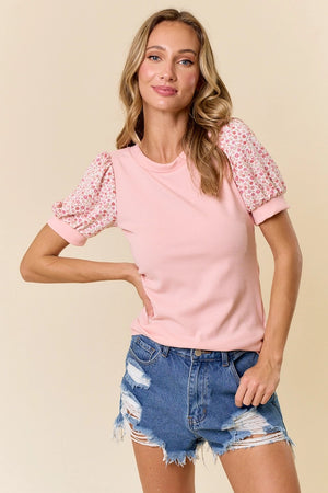 This cute, floral sleeve top is perfect for Spring into Summer! Make a statement with this charming and comfortable floral printed top. This top features a solid color, ribbed texture body, round neckline with short cuffed sleeves featuring a floral print.