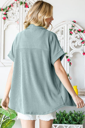 Elevate your casual wardrobe with this textured button-up shirt. Crafted from a soft, ribbed fabric, this relaxed-fit top features short sleeves, front flap pockets, and a laid-back collar. The lightweight material and easy button-front design make it perfect for layering over tanks or wearing on its own. Whether you're heading out for a sunny stroll or lounging in style, this shirt adds effortless charm to your everyday look.