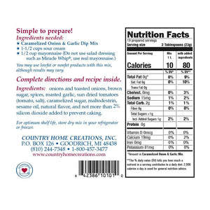 Caramelized Onion & Garlic: This mouthwatering dip mix combines sweetened caramelized onions with roasted garlic and is delicious with potato chips, pretzels and vegetables. It also tastes great served warm in a slow cooker.
