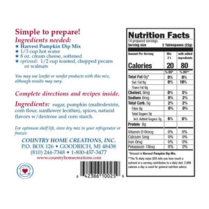 Harvest Pumpkin: This dip mix is for all of the pumpkin pie lovers that can't get enough! This mix is one of our autumn best sellers. Simplify your gourmet with this favorite!