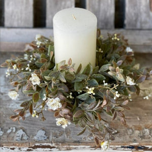 This collection features small, colorful rosettes peppered throughout a bed of mixed, lightly-powdered greenery with small berry-like orbs. Great as a candle ring or little wreath!