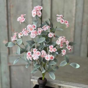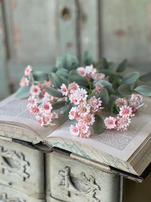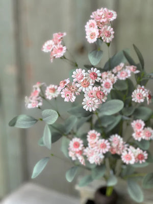 Bring a soft pop of color and airy texture to your home with this beautiful faux blush daisy spray. Featuring delicate pink-centered blooms paired with muted eucalyptus-style greenery, this stem offers a fresh, gathered-from-the-garden look without the upkeep.