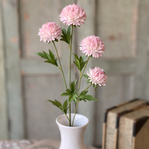 Bring a soft touch of color to your home with this beautiful faux pink pom-pom flower stem. Featuring four layered blooms with subtle white undertones and fresh green foliage, this stem offers a natural, garden-inspired look with realistic texture and detail.