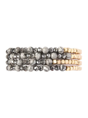 Cute bracelet stack -- includes 4 bracelets in a mix of stone and gold beads. These are perfect for layering or gift ideas for a friend!