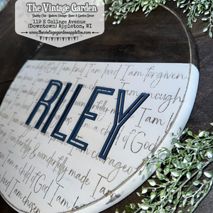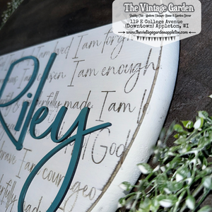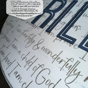The top portion of this sign is stained, the bottom painted. The sentiment text is engraved into the wood, the name is cute from 3mm wood and attached.This sign is made of pine -- each piece is handpainted so there WILL be variations in distressing, wood patterns, knots, dings and dents... all adding to the uniqueness of the piece. You can choose to either have a jute rope hanger, or sawtooth hanger on its back. Approximate sign dimensions available: 12" Diameter, 15" Diameter or 18" Diameter x 1" Thick.