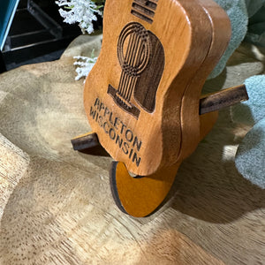 Celebrate your love for music and local pride with this Appleton, Wisconsin engraved wooden guitar pick holder. Designed to look like a mini acoustic guitar, this handcrafted piece features intricate laser-engraved details, a magnetic closure, and a hidden compartment that holds a custom wooden guitar pick engraved with “Appleton Rocks” and a Wisconsin state outline.