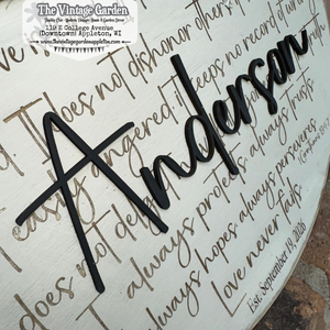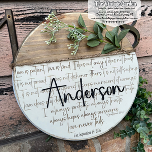 The top portion of this sign is stained, the bottom painted. The sentiment text is engraved into the wood, along with the date you choose. The names are cut from 3mm wood and attached. Sentiment Text: Love is patient, love is kind. It does not envy, it does not boast, it is not proud. It does not dishonor others, it is not self seeking, it is not easily angered, it keeps no record of wrongs. Love does not delight and evil but rejoice is in truth. it always protects always trusts always hopes always persevere. Love never fails.