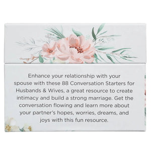 Transform your relationship with the 88 Great Conversation Starters for Husbands and Wives. This tool will encourage couples to learn more about their partners, understand their interests, and strengthen their bond. Blush pink box with peachy pink florals and rose gold-foiled title.