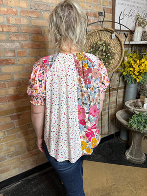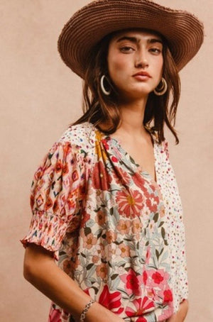 Fresh, flirty, and full of charm—our floral blouse is your go-to for effortless summer style. Adorned with a mixture of floral prints, this breezy V-neck top features smocked sleeves and a relaxed silhouette perfect for beach strolls, brunch dates, or warm-weather getaways. Pair it with denim and sandals for a laid-back look or tuck it into a skirt for a touch of elegance.