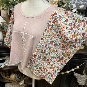 Wrap yourself in inspiration with this handmade top crafted from a reclaimed “Faith” graphic T-shirt and cozy floral fabric. The soft blush pink front features a bold vertical “faith” design, while the roomy, boho-chic sleeves showcase a rich, autumn-toned floral print for a perfect mix of comfort and charm. This one-of-a-kind piece is ideal for layering through the seasons and makes a heartfelt statement wherever you go.