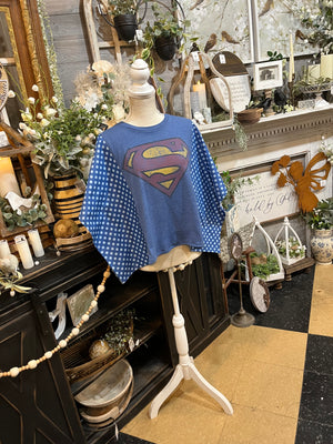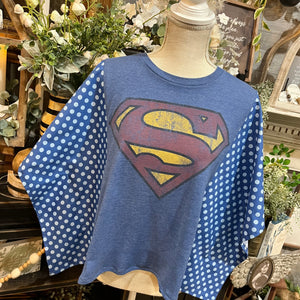 Show off your superpower in style with this handmade top crafted from a reclaimed Superman graphic tee and playful polka dot fabric. Featuring the iconic distressed “S” logo on a soft heathered blue body and wide-flowing sleeves in bold blue-and-white polka dots, this one-of-a-kind piece brings heroic charm to everyday fashion. Lightweight and breezy with a relaxed fit, it’s perfect for casual days, comic con flair, or anyone channeling their inner superhero.