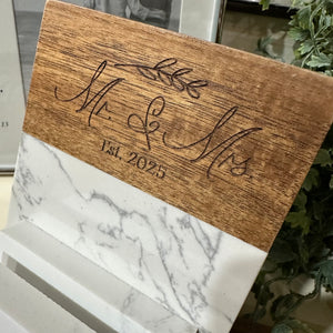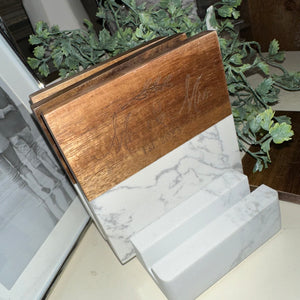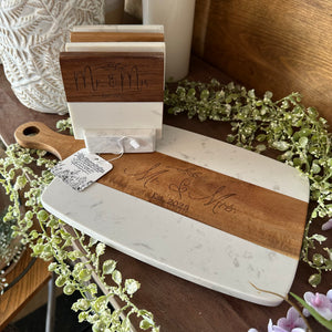 Cutting board and coasters are natural wood and marble -- each piece is unique so there WILL be variations in distressing, wood patterns, knots, dings and dents... all adding to the uniqueness of the pieces. Some of the wood elements will be slightly lighter/darker in color and some of the marble more white or more grey/black. All words and designs are engraved into the wood.
