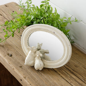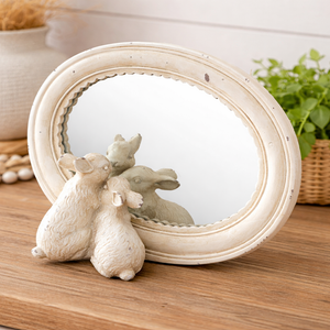 Sweet and timeless, this distressed oval mirror brings a soft cottage charm to any space. Framed in an antique-inspired ivory finish with subtle distressing, the piece features two sculpted bunnies nestled at the base — a darling detail that adds warmth and whimsy without feeling overdone.