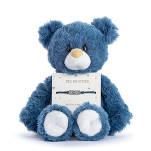 Welcome a new sibling with this cuddly Big Brother Teddy Bear. Made from soft, plush fabric in a bold blue hue, this lovable bear comes with a matching bracelet that proudly reads “BIG BRO.”