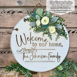 This sign is painted white and is lightly distressed throughout for a worn, well-loved feel. The "Welcome" and family name are cut from 1/4" wood and attached (they are both stained a natural wood color). The "to our home," line of leaves and first names of the family members are engraved into the wood. The faux greens and florals will vary slightly as they are each uniquely created. They are attached to a wood piece which is then velcroed to the sign -- this allows you to swap out the greens seasonally. We will have fall and winter bow/florals/greens options available in each season as replacement options.