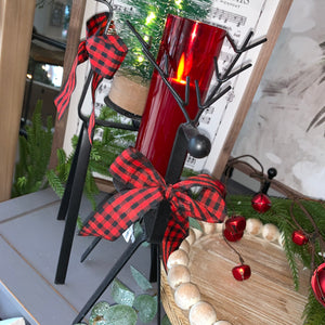 Made of metal, fabric ribbon (ribbon can be removed). Deer only -- tree or candle shown is sold separately.