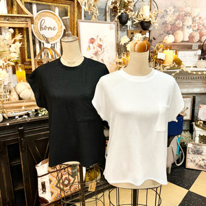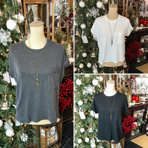 This piece has the perfect texture for under a flannel, shacket or sweater! It is short-sleeved so you don't get too warm and complete with a pocket detail. Also cute on its own!