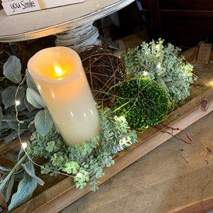One of my favorite additions to any setting! These tiny lights are battery operated so they add a sweet ambiance to any display-- they are on a flexible wire that can be tucked into greens or twisted around anything. They have a built-in 6 hour timer so they will come on at the same time each day for you!