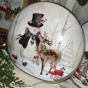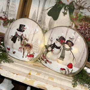 Bring the warmth of winter wonder into your home with these charming lighted snowman luminaries. Each piece features a whimsical snowy scene—one with a joyful snowman family, and the other with a friendly snowman greeting a woodland deer.