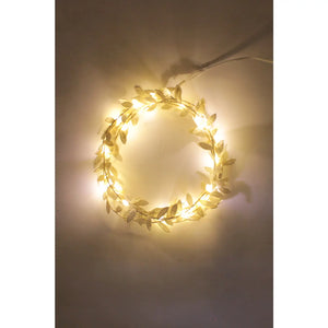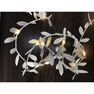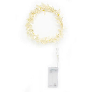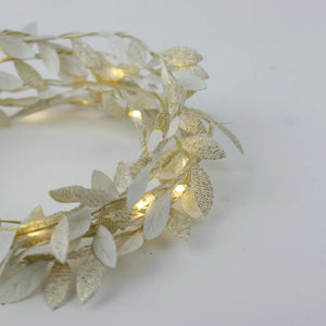 One of my favorite additions to any setting! Delicate gold leaves are intertwined with copper wire fairy lights to create an inviting glow.These tiny lights are battery operated so they add a sweet ambiance to any display-- they are on a flexible wire that can be tucked into greens or twisted around anything.