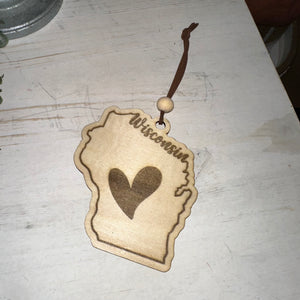 Details: Made of solid alder wood, laser cut, with red string. hanger. Approximate state dimensions: 3.75" x 3.5"