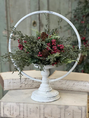 Beautiful and unique, this frosty cedar half sphere is perfect for Winter! With its glittering mixed greenery dashed with snow, berry clusters and peppered with pine cones, this collection has it all! Also available as a large wreath and bush.