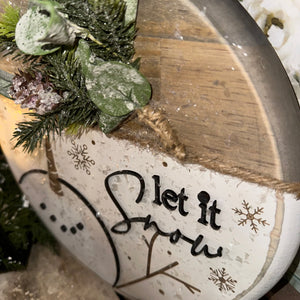 From our holiday collection! We hope you enjoy these unique rounds as much as we have enjoyed creating them! Each sign is unique, complete with layered and engraved wood sentiments, greens and finished with a snowy texture. Perfect to adorn your home or give as a gift this holiday season!