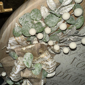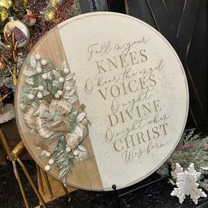 From our holiday collection! We hope you enjoy these unique rounds as much as we have enjoyed creating them! Each sign is unique, complete with layered and engraved wood sentiments, greens and finished with a snowy texture. Perfect to adorn your home or give as a gift this holiday season! This one also includes battery operated, timer lights tucked into the bow and greens!